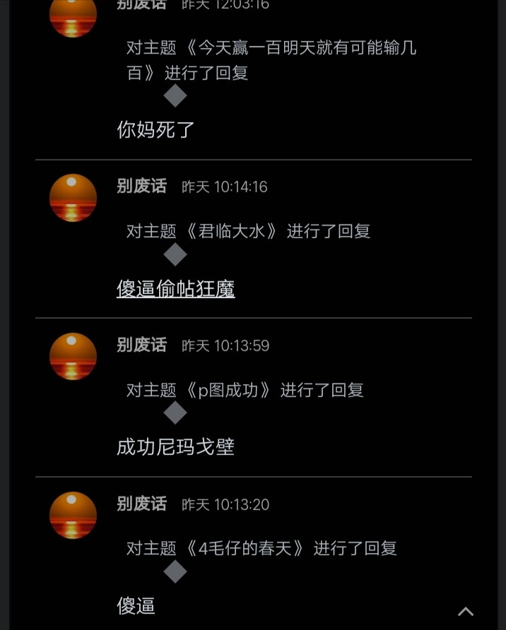凌晨18厘米: 大过年的挂壁了 要发泄的话 就找你妈去卖逼 你妈卖逼了 有钱了你就可以去赌博了