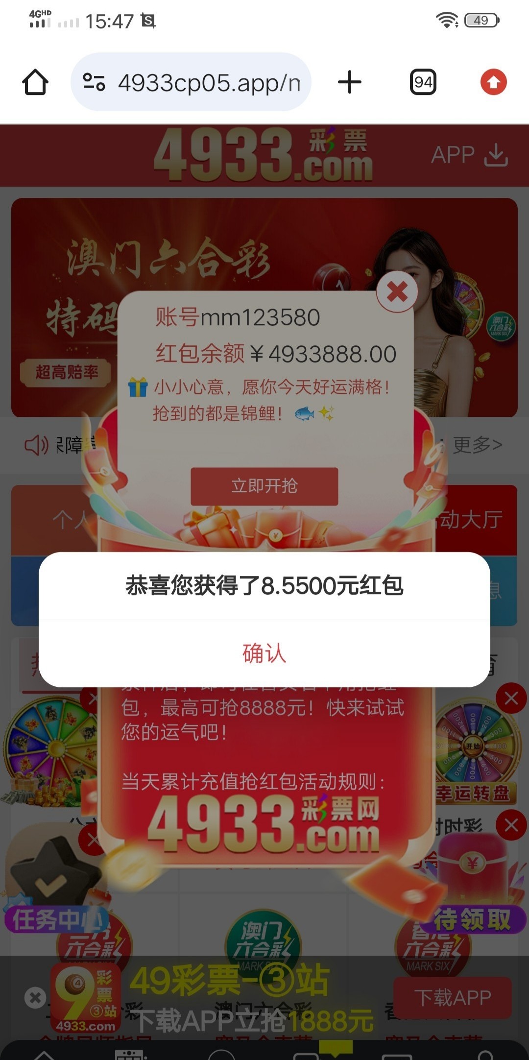 网站4933.com,免费红包有号可以上去看看,就刚出来的时候我充过。今天上去试了一下抢了8块。