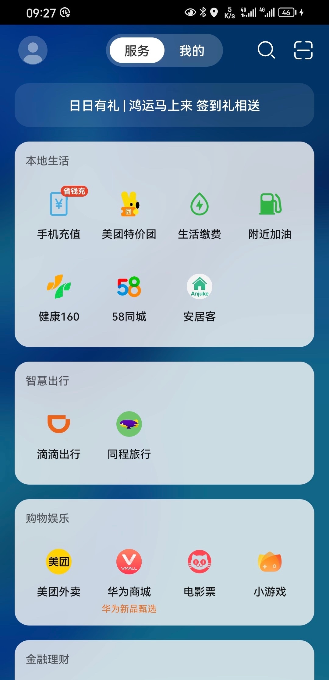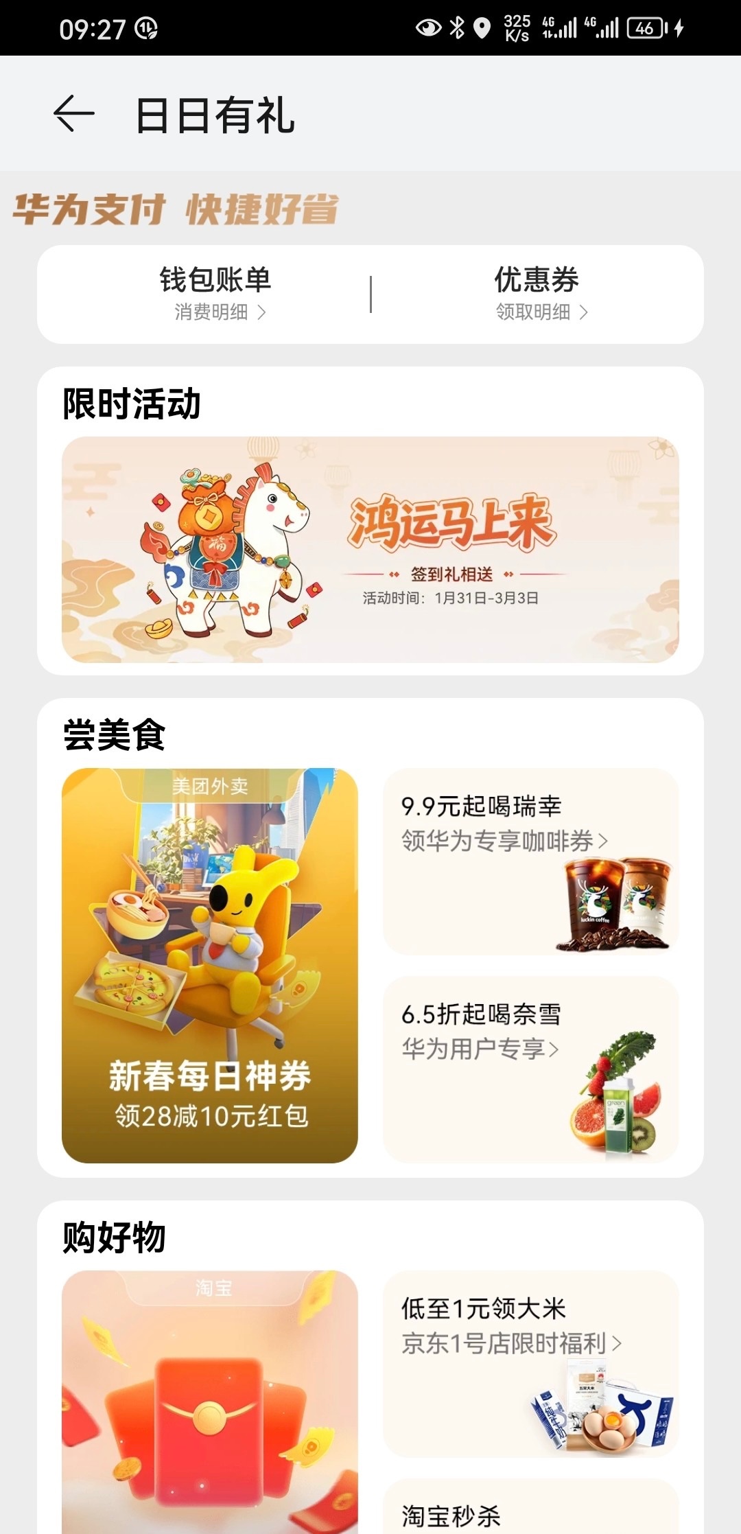 用华为手机的老哥,往左滑到服务,点击日日有礼签到,优惠券可以用来点美团,能省则省。
