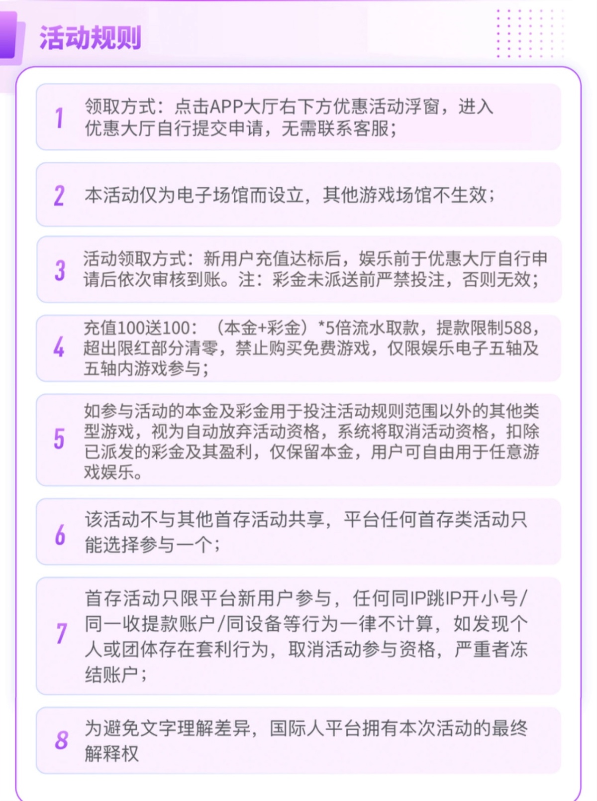 活动:新用户首存100+100(只能娱乐电子游戏(不能买免费),井且满足5倍流水最低提款588元最高也是588)首存活动只能参加一个参加100+100其他首存活动都无法参与,本活动仅限独立账户参与,如同一姓名、同一手机号、同一IP.同一银行卡账户多账户均不参与,该活动需要在未下注前申请