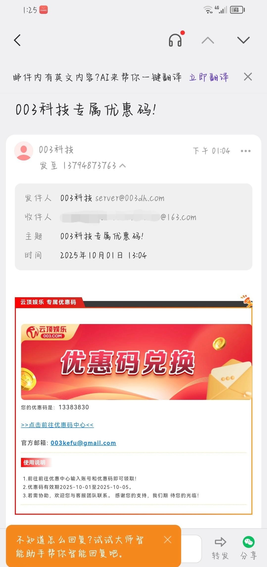 玩过云顶娱乐的老哥可以看看邮箱有没有优惠码 有的话去优惠码中心入口领取 我就充值过玩过100 领了18 链接003.com