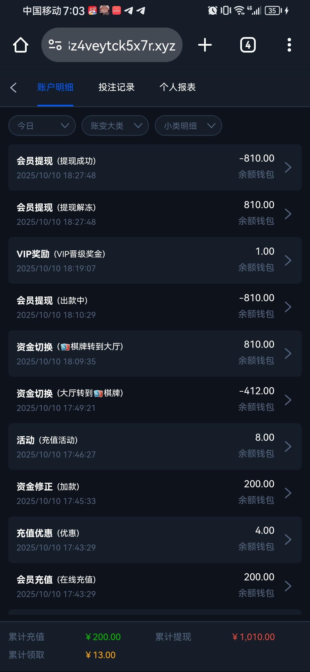 下午被新葡京83260这黑台黑了我个首充,三百都不给提,没想到下午四五点的时候接了个特邀,送了88,三倍流水,还不限制游戏,三分钟我就干到200出了,然后充了个200+200,本一彩三,没敢存一千,出多少存了多少,对于我来说也是0难度,几分钟就干到八百