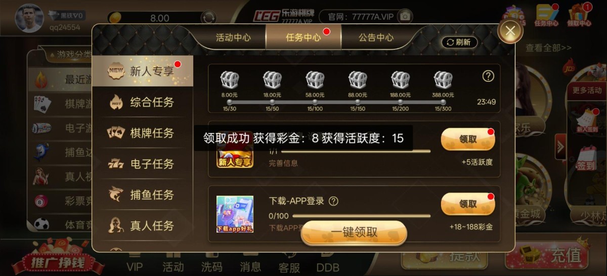 新人注册绑定银行卡手机号邮箱任务领取8彩金