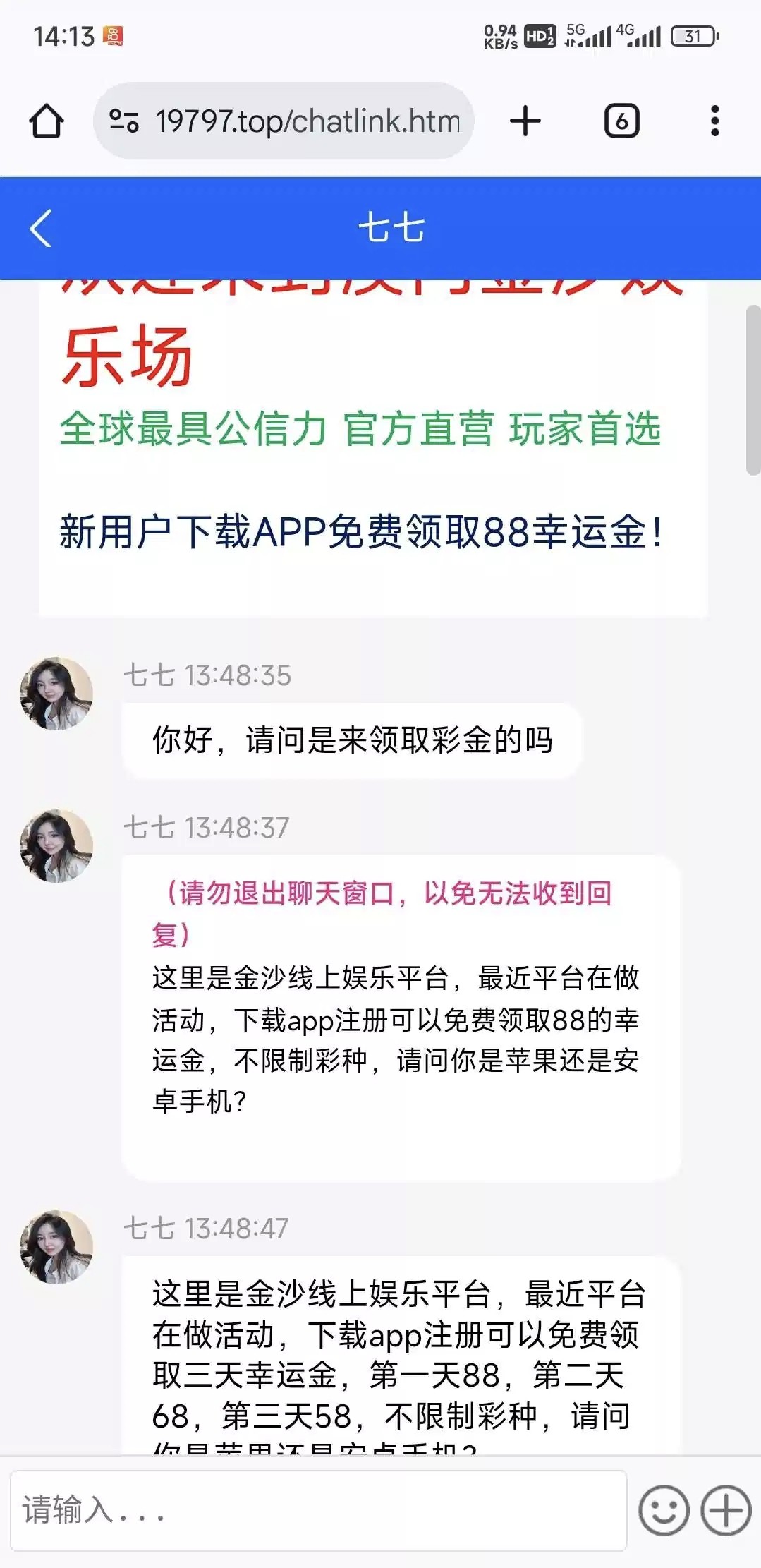 费可可 我今天也是接到一个电话说送88他让我加群才能有网址,我加了,然后想要网址就要下载个文件,说是网址在文件里,我果断退群了,真扯淡,一个网址搞这么麻烦,还不知道想干嘛了