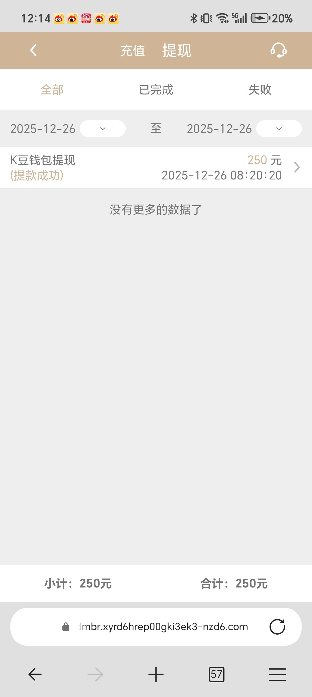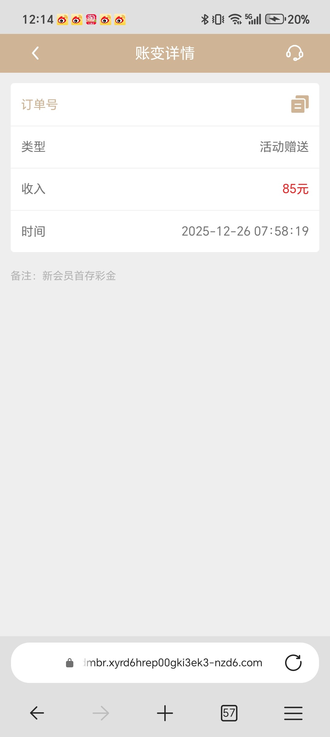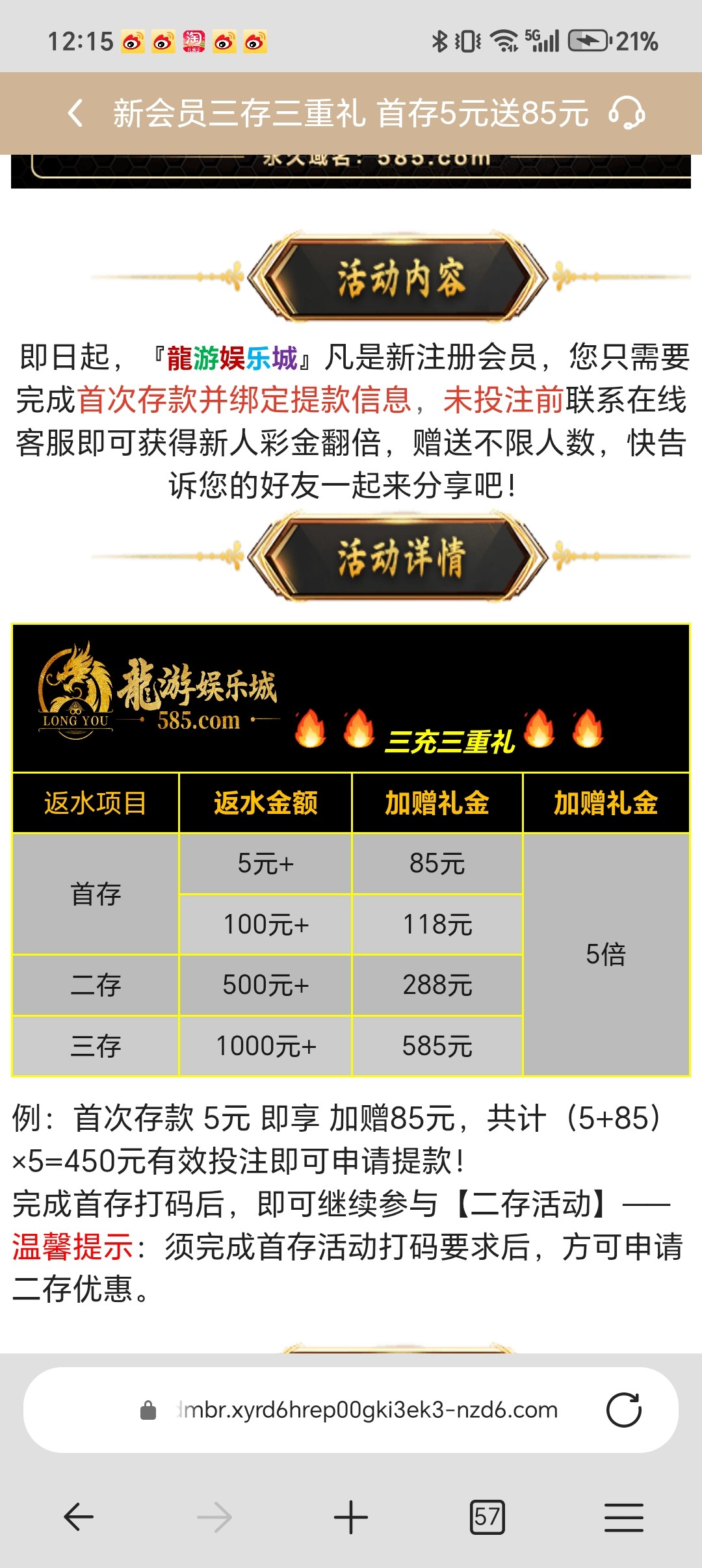 注册充值5+送85,钱包10元就可以充值,出了250。客服回的比较慢耐心点。网址 585.com 打出来的老哥助力下