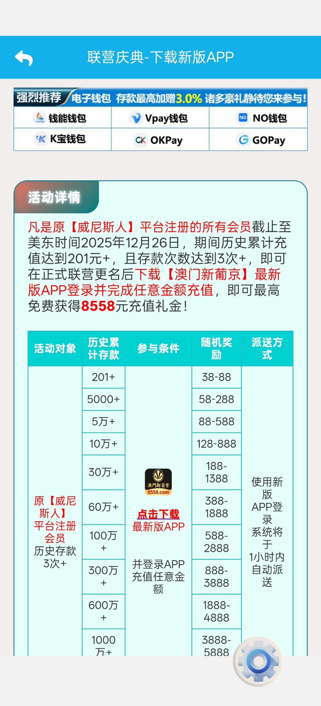 29号有彩金,今天也有彩金,下载新APP然后充值任意一笔钱系统在一个小时内送38彩金,最多用钱包可以冲10块钱