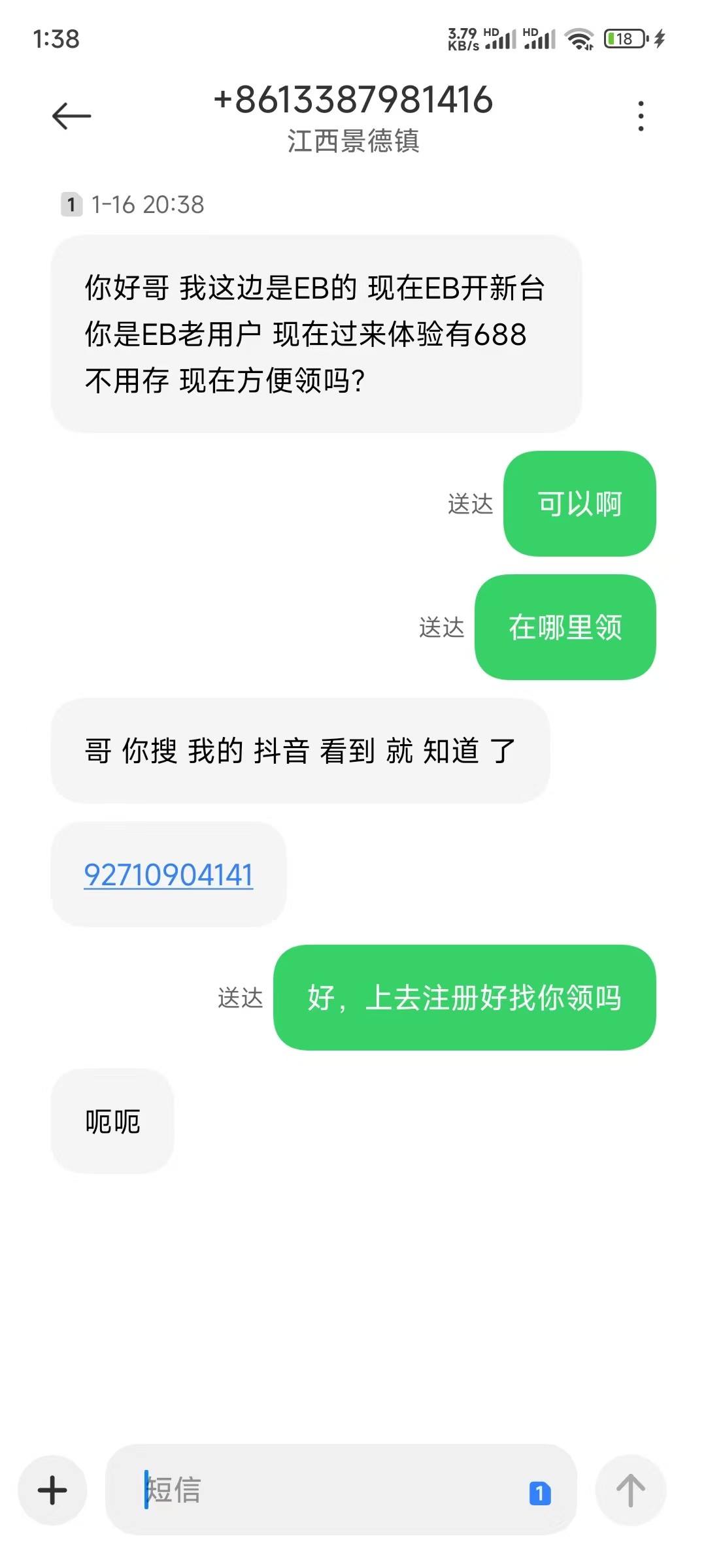 今天收到手机短信,说是EB开新台,老用户送688,捧着免费白菜的心态回复了,然后让我下载一个球聊的软件加专员,加了专员后让我在hqcx.com上面注册新号,说是免费送688,VIP0送88,打到VIP1送100,VIP2送200,VIP3送300,总共送688,中间一直给我推送充多少送多少的活动,其中迫切的问我什么时候开始充值,我说先试玩下,送了88,要求5倍水,我按照要求打了450的水,88打到219,申请提款,然后就是一直审核,等了半个小时,先是球聊的软件说我是刷子,把我账户永久封禁,接下来就是环球诚信的网站也登录不上了,账户异常,劝大家这几天收到此类短信千万不可信,充值了就是送狗了