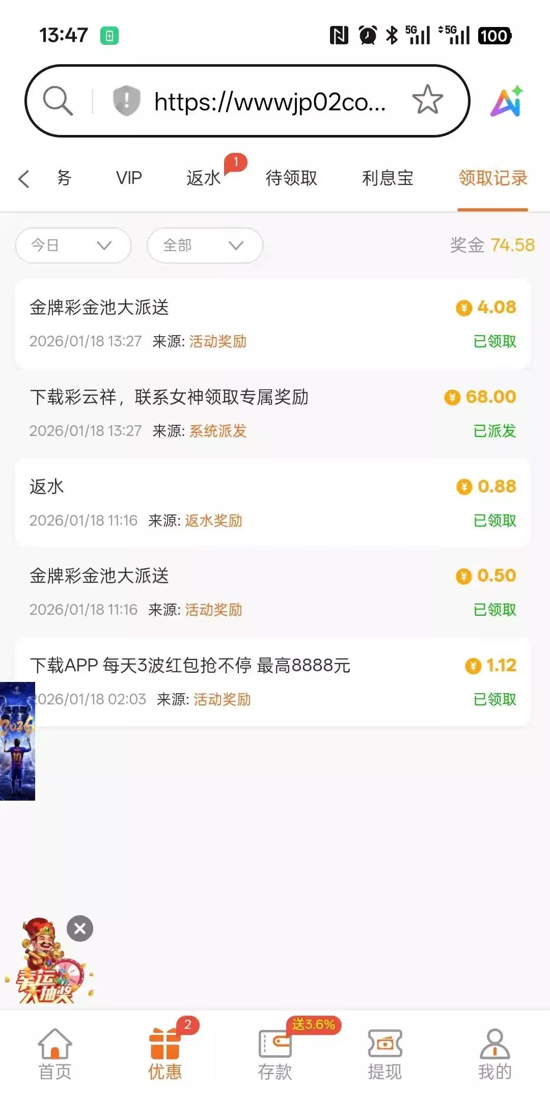 链接jp22.com下载彩云祥签到7天领68三杯水