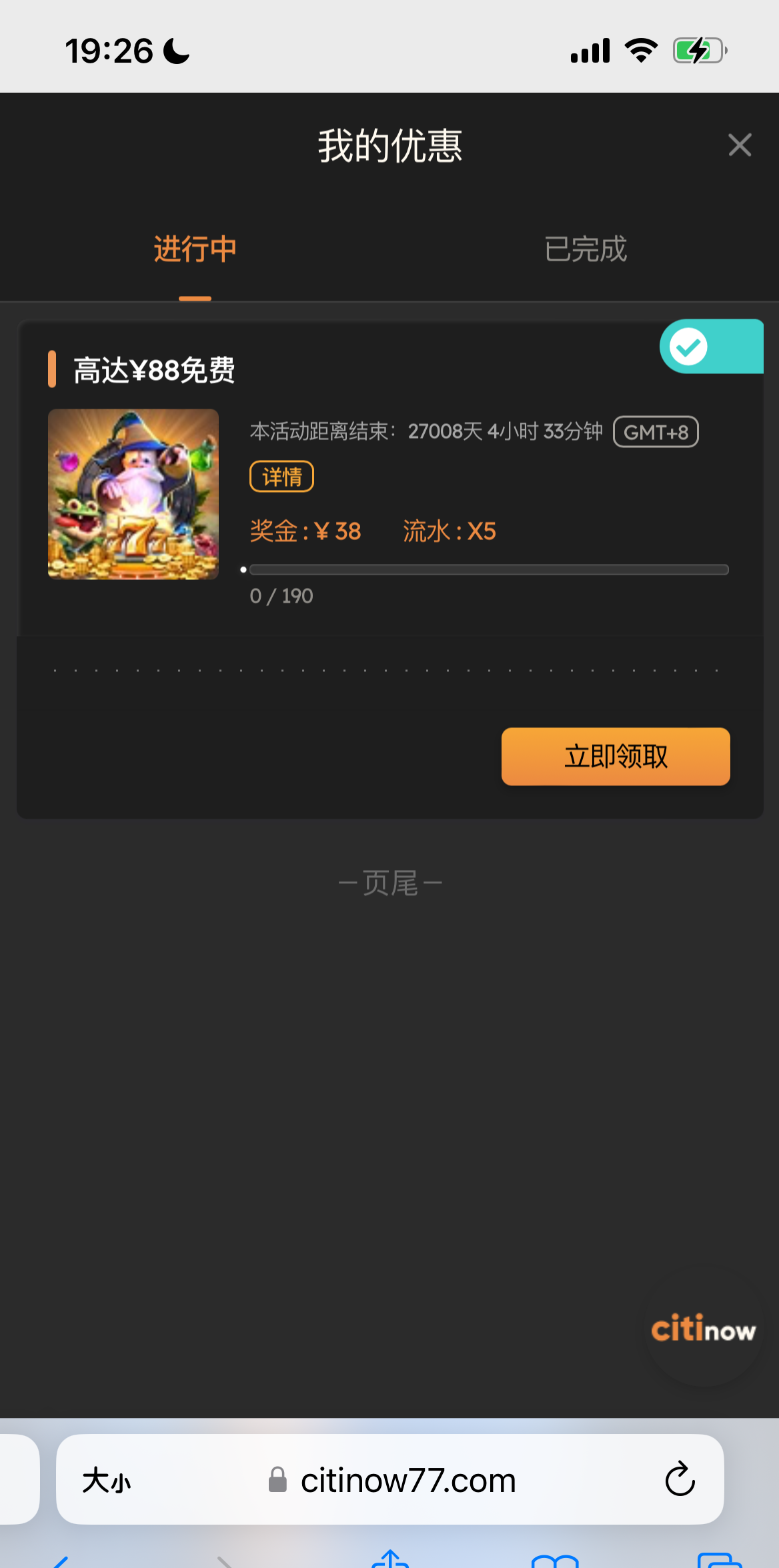 注册账号了手机号接收不到验证码的话找在线客服申请手动验证,客服会让你加客服微信验证就可以了,验证完在个人中心我的优惠里领取,要打190流水才能转出中心钱包,我就撸了一个号没打出来,老哥们加油,好像还没看到有人发过这个,祝各位大红,网址https://citinow77.com/cn/cn