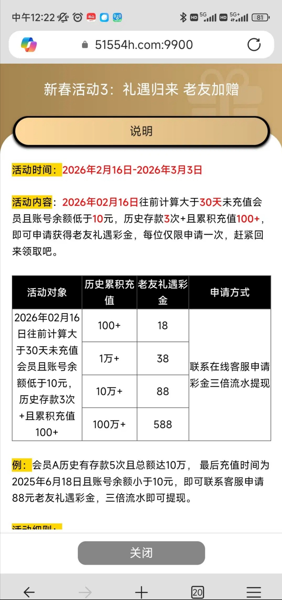 春节活动(原韩国赌场)看图片活动符合要求的可以去,我给了88,很久以前玩过的老用户最近一个多月没玩的应该都可以申请的,地址51554h.com