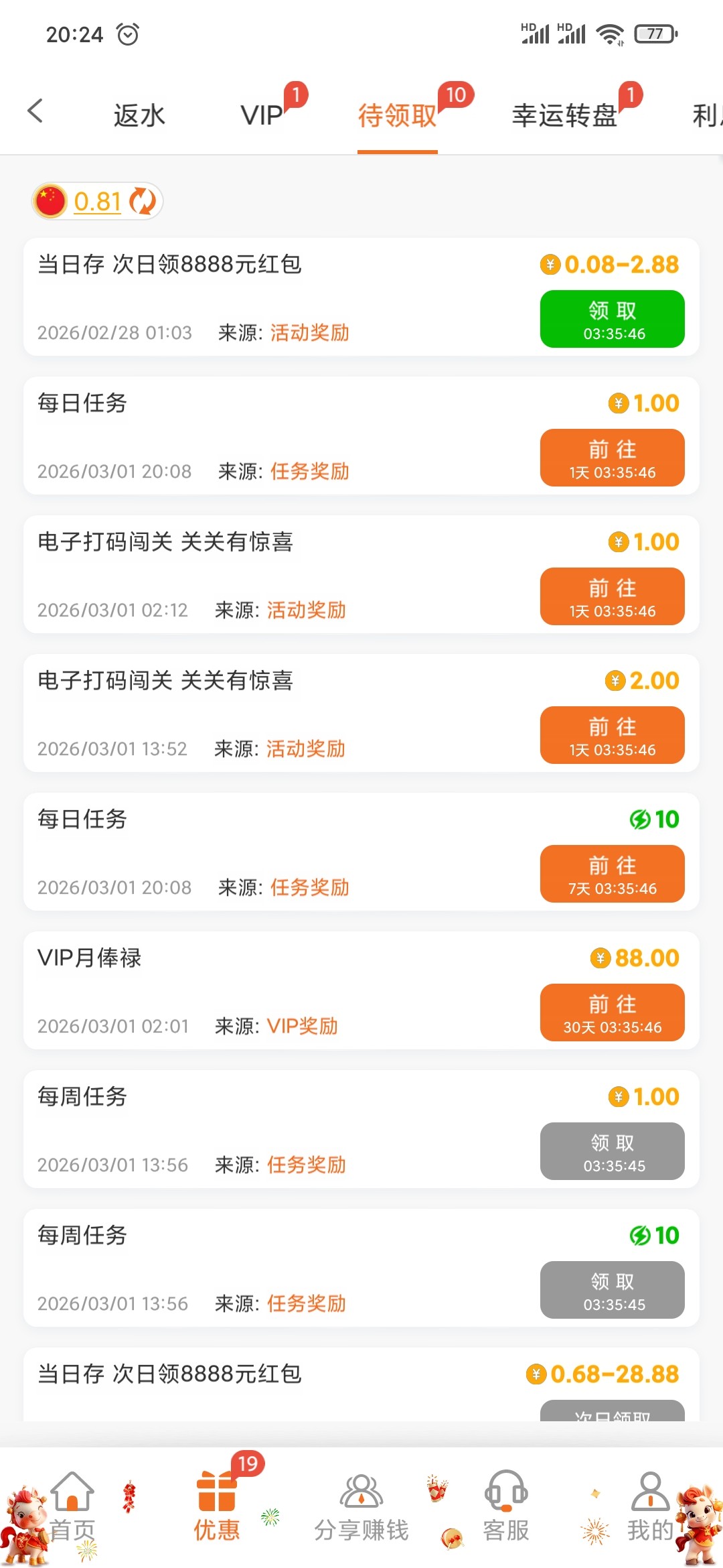 好久没被这种台子恶心了,福利都给我禁止了。就是因为我天天玩以小博大30+29,现在把活动什么都给我禁止了,等级降了不说,客服也是恶心的一逼。该死的转移台子,玩不起就别玩了。太恶心了,还叫我继续充值活跃。返水啥都领不了,看着我像大冤肿