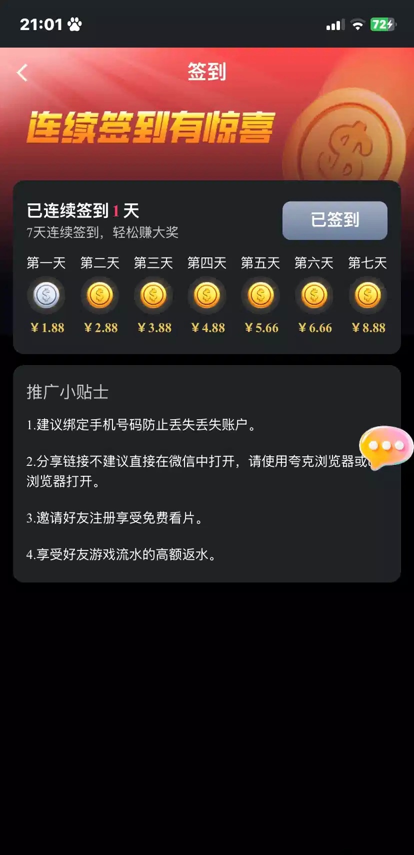 绑定手机号码得两块 签到得1.88可以免费签到一个星期有毅力的老哥可以存到第7天玩