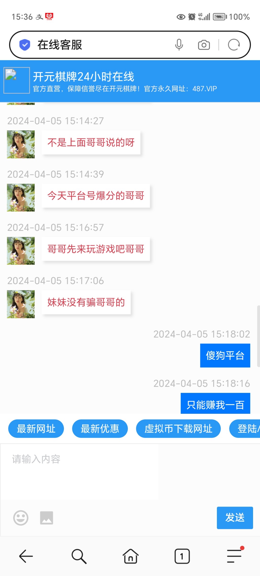 新葡京2523.vip,开元473.vip,都是收到短信,发给它.客服工作人员就说是100+100,三水,充好之后就送20,都是套路,千万不要搞,