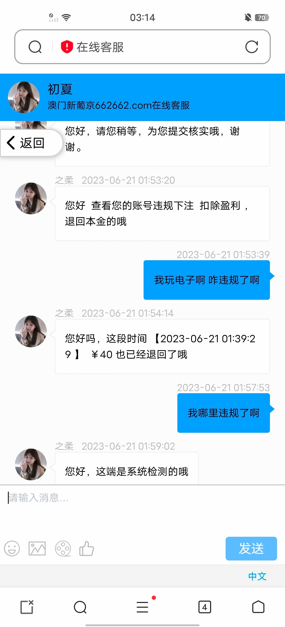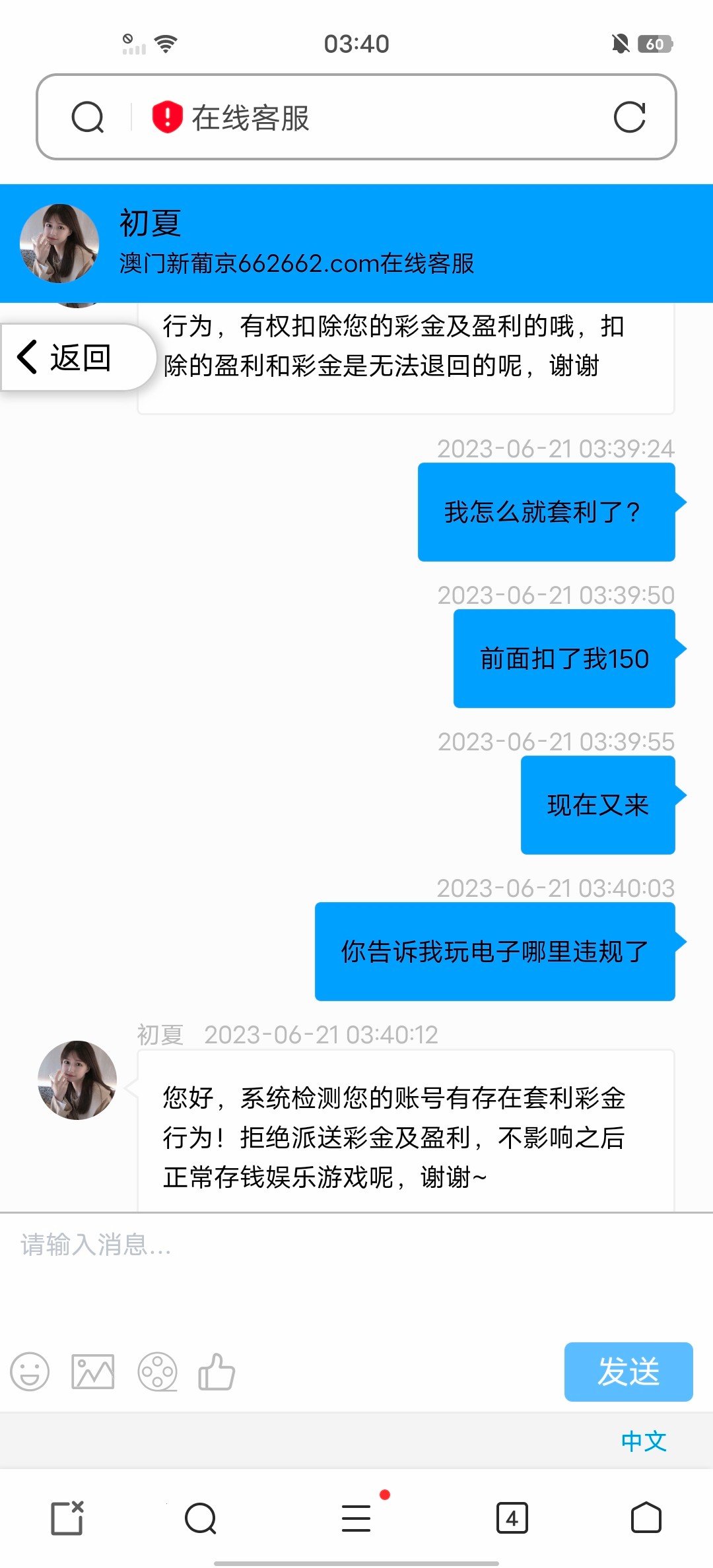 充了40  赢了提现190然后扣除了150退回我40说我电子违规下注      后面40我在去玩赢了提现100直接就给我全部没收了   说我套利  我什么优惠都没有申请的套他妈币   虽然钱不多但这种操作就很恶心