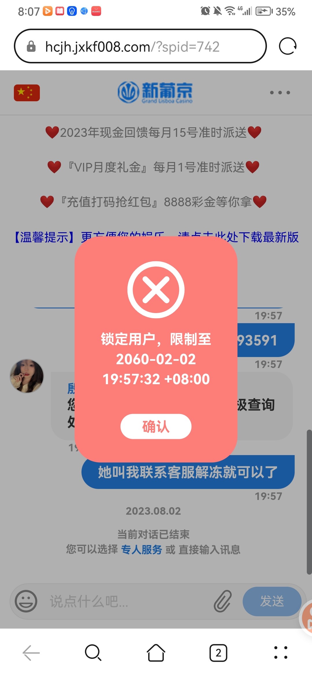 草特么刚刚接到电话说回访送18 加签到每天9块 登入显示账号冻结 客服直接把我对话框都锁了 第一次见这么恶心的
