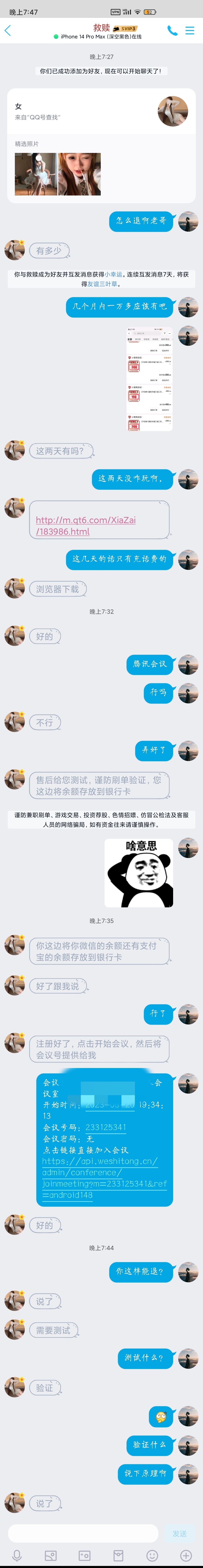 老哥我也没去加他,但是我一看见他要看银行卡余额然后开腾讯会议我就知道了是骗子