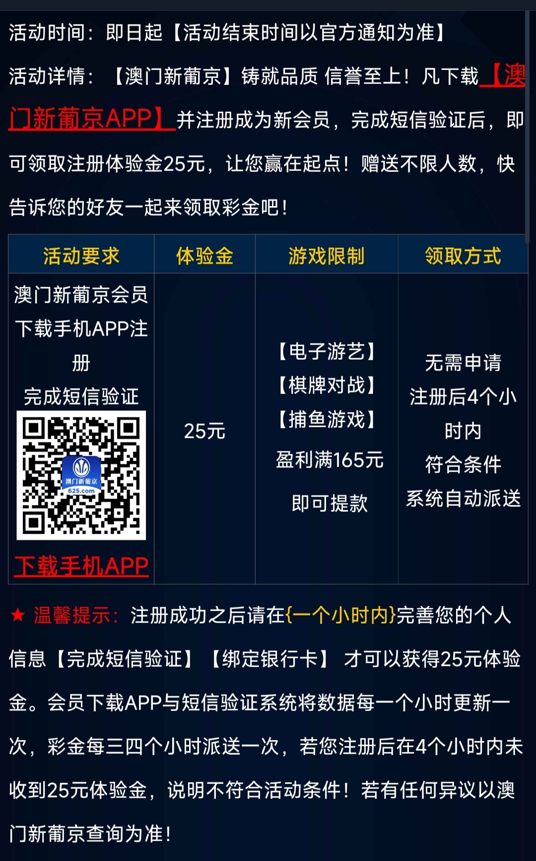 活动:新用户注册完善资料四小时内送25,不送就是多IP。无游戏限制,最低165提。不要老是说这种不送,你不送不代表别人不送,这种十个人估计就送四个,完全看狗庄心情。还是那句话,撸不一定有,不撸一定没有。