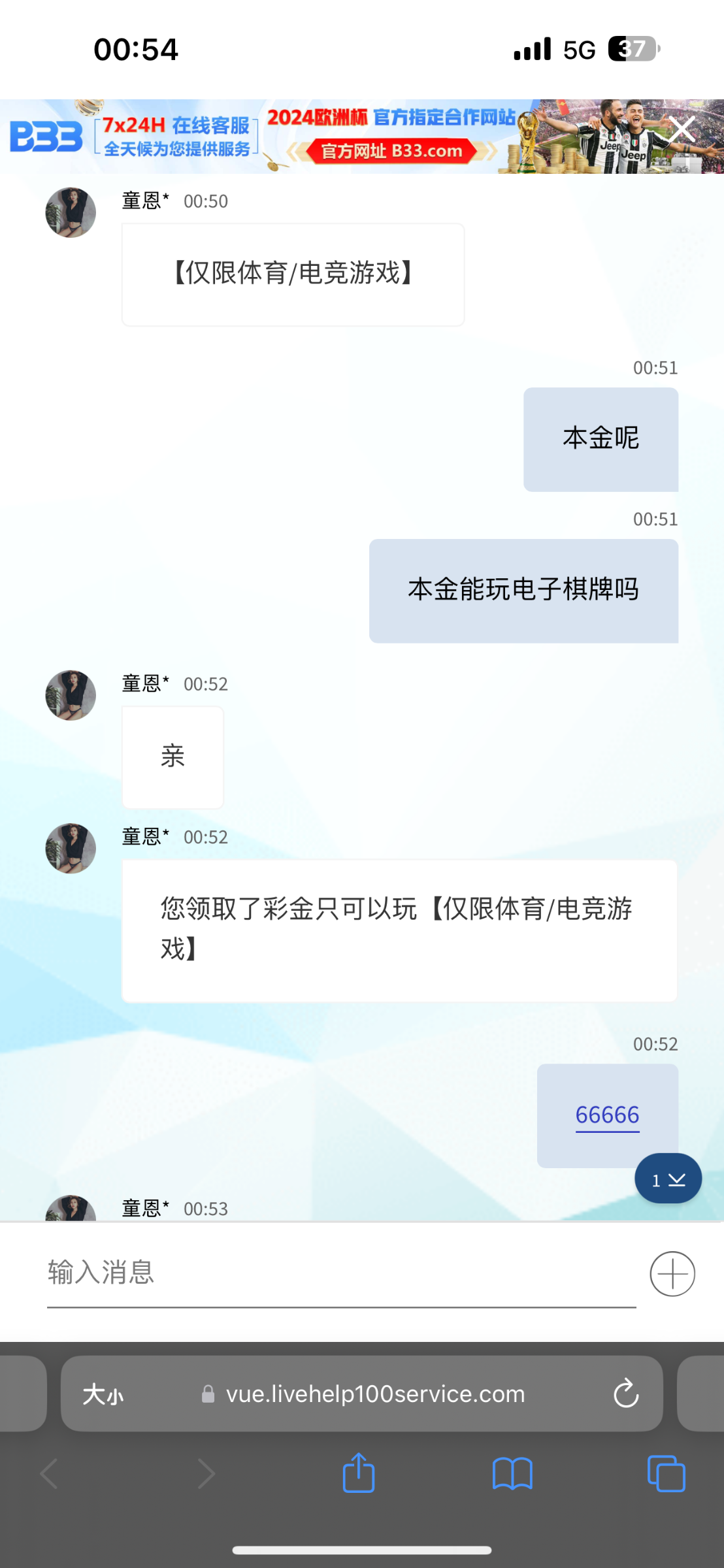 说充值500联系客服送258,结果充了客服只送了88,还只能玩体育电竞,我只能说6,有没有会玩体育电竞的,来帮忙玩,不会玩,草他妈的傻逼路人