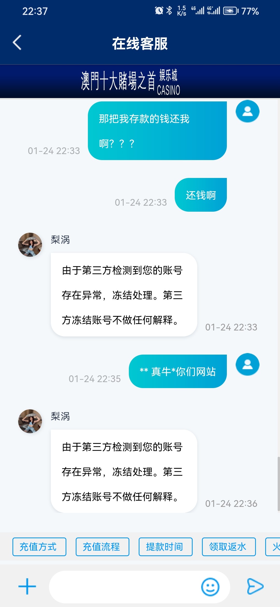 在这存款玩偶尔领个小彩金 大概输个几百块 今天存款一百出款三百直接给冻结账号
