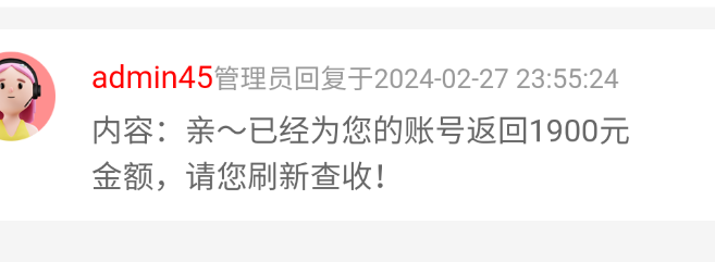 我是最后一笔冲了1900,然后就没有玩过了,而且这1900输掉了,第一次赶上这种好事,然后网站把钱退我了,有充值过的不管多少都可以申请