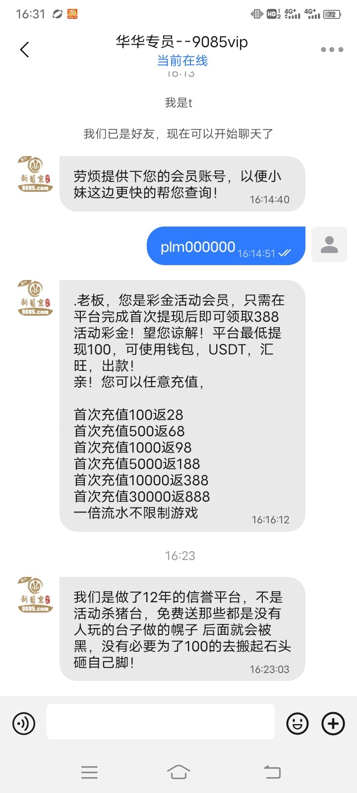 骗人的,我充了1000都没给我送388,还要我再用钱包充300然后每天充300才能送38,送满388,诈骗台避雷