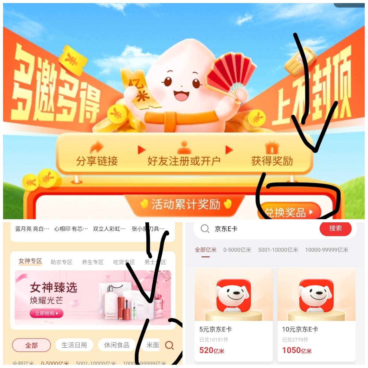 点进去下滑搜索京东E卡选10元的兑换,1100积分>1050,不用花一分钱