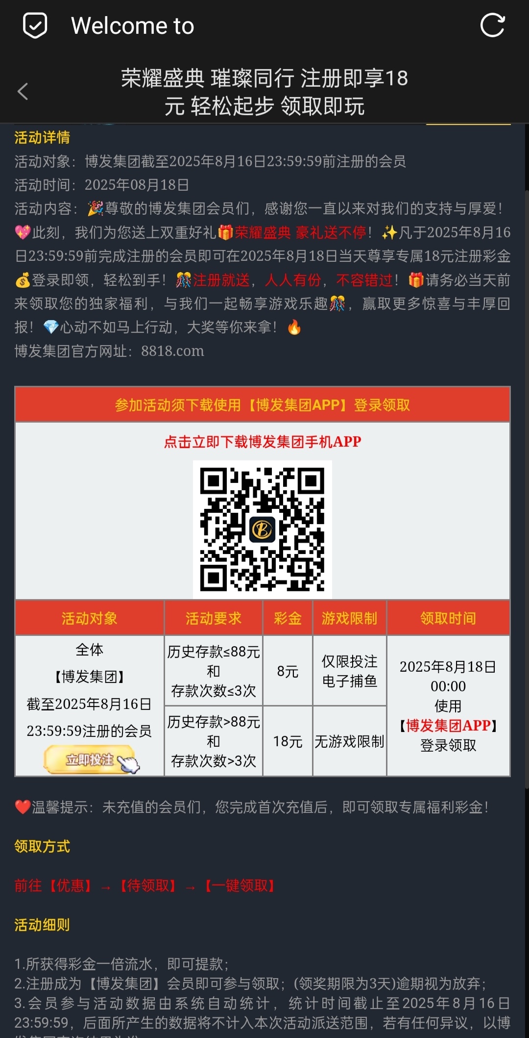 有号的老哥登录自行查看有没有回馈18彩金,有就有没有无视吧