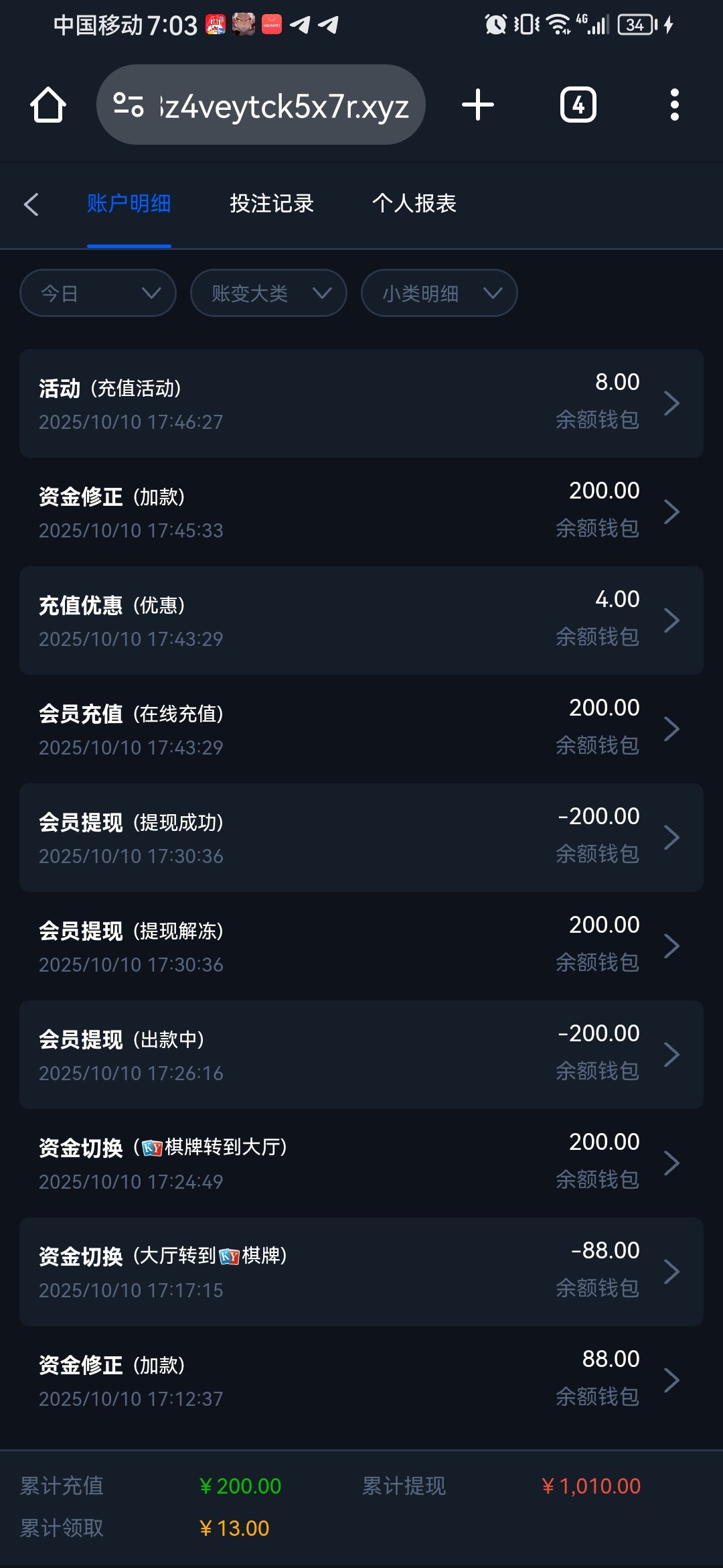 下午被新葡京83260这黑台黑了我个首充,三百都不给提,没想到下午四五点的时候接了个特邀,送了88,三倍流水,还不限制游戏,三分钟我就干到200出了,然后充了个200+200,本一彩三,没敢存一千,出多少存了多少,对于我来说也是0难度,几分钟就干到八百