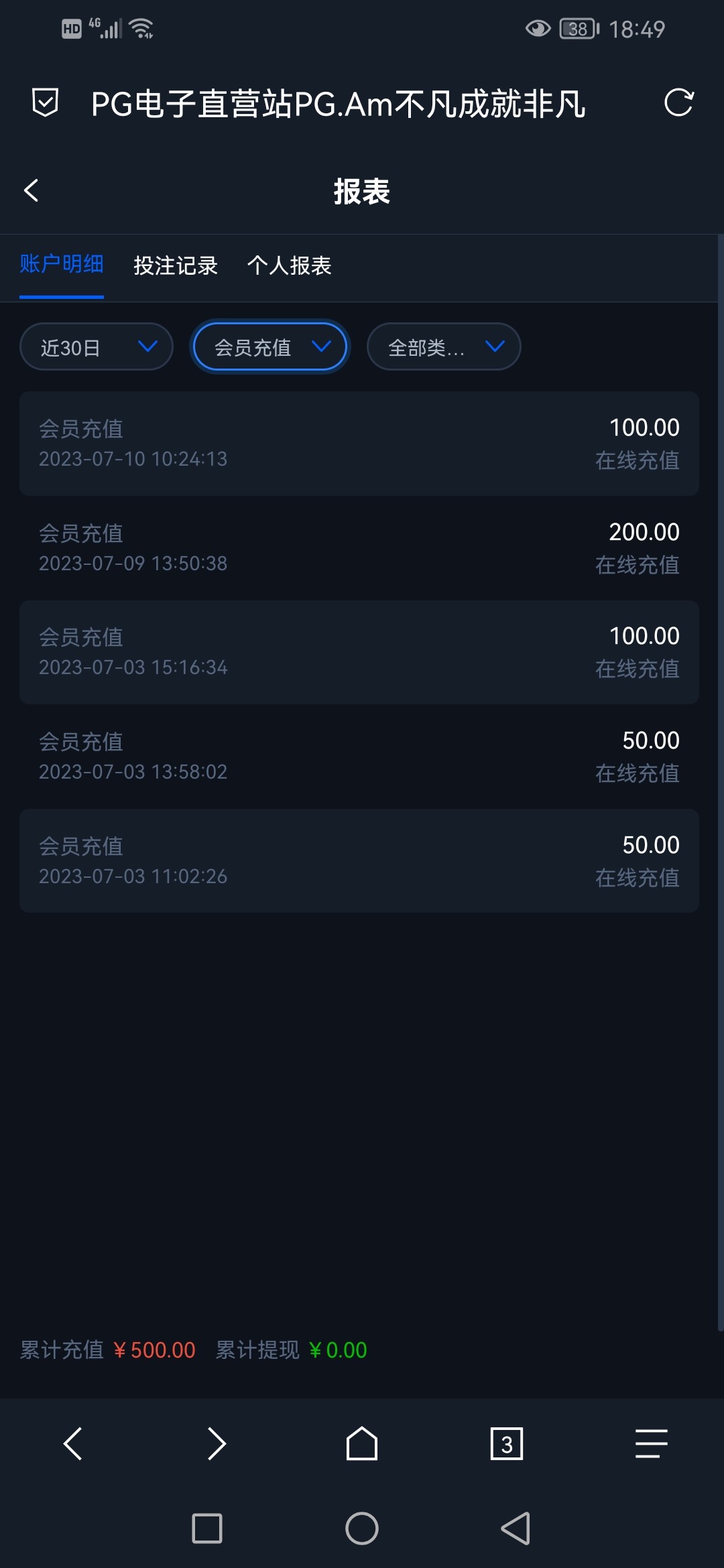 一天充100,充了五天,一分钱没提现过